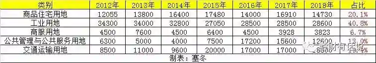 再看另一个内陆中心城市的供地情况,其人口规模和上面这个城市是类似的。从2012年到2018年,这个城市的各类供地指令性计划如下表所示,可以感受一下住宅用地的低比例: