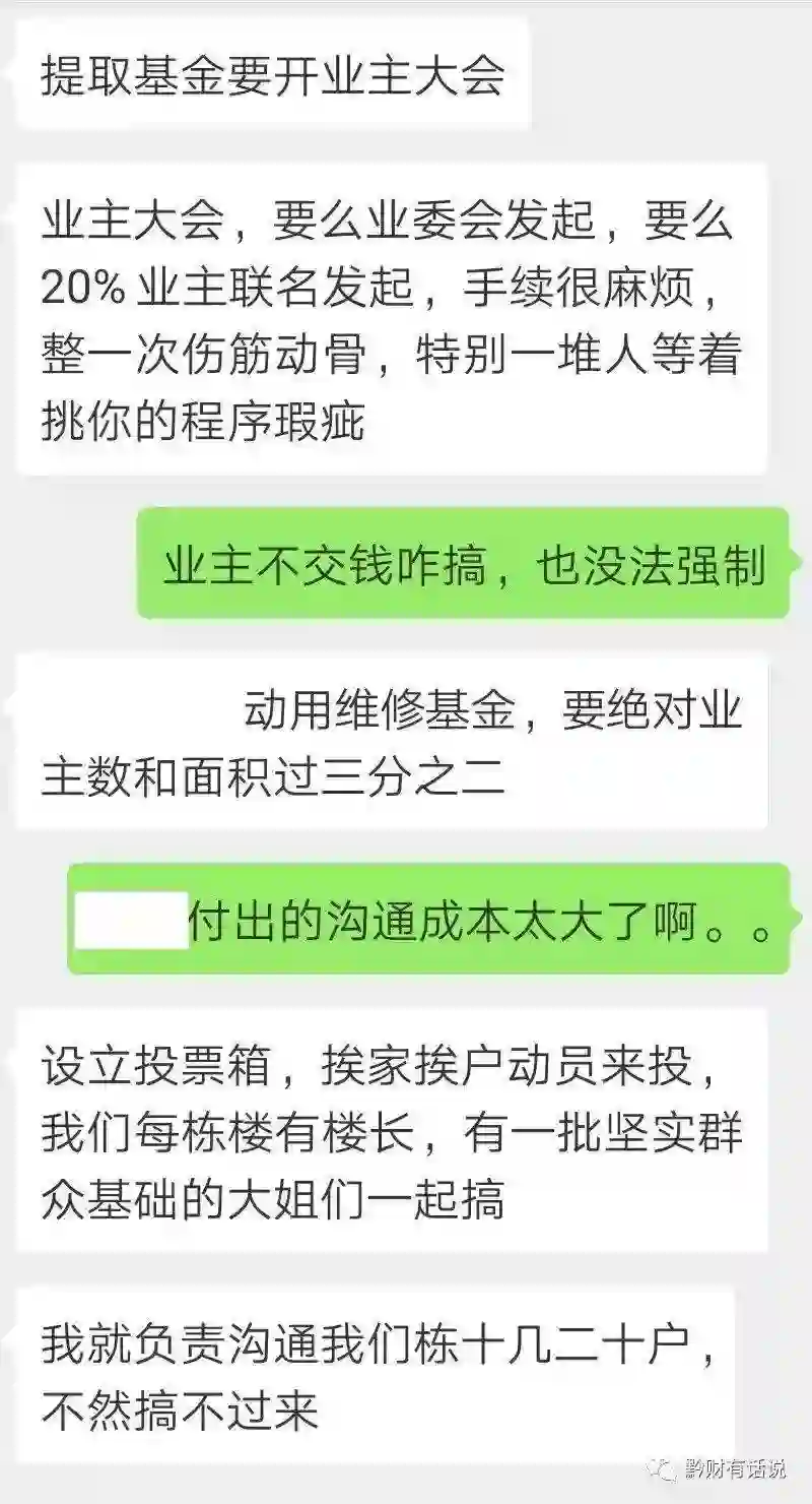 以换电梯为例:换电梯需要提取公共维修基金,提取公共维修基金需要成立业委会,而成立业委会则需要成功召集由一半业主参加的业主大会。且业委会成立后,还需要2/3业主同意,才能动用公维基金。