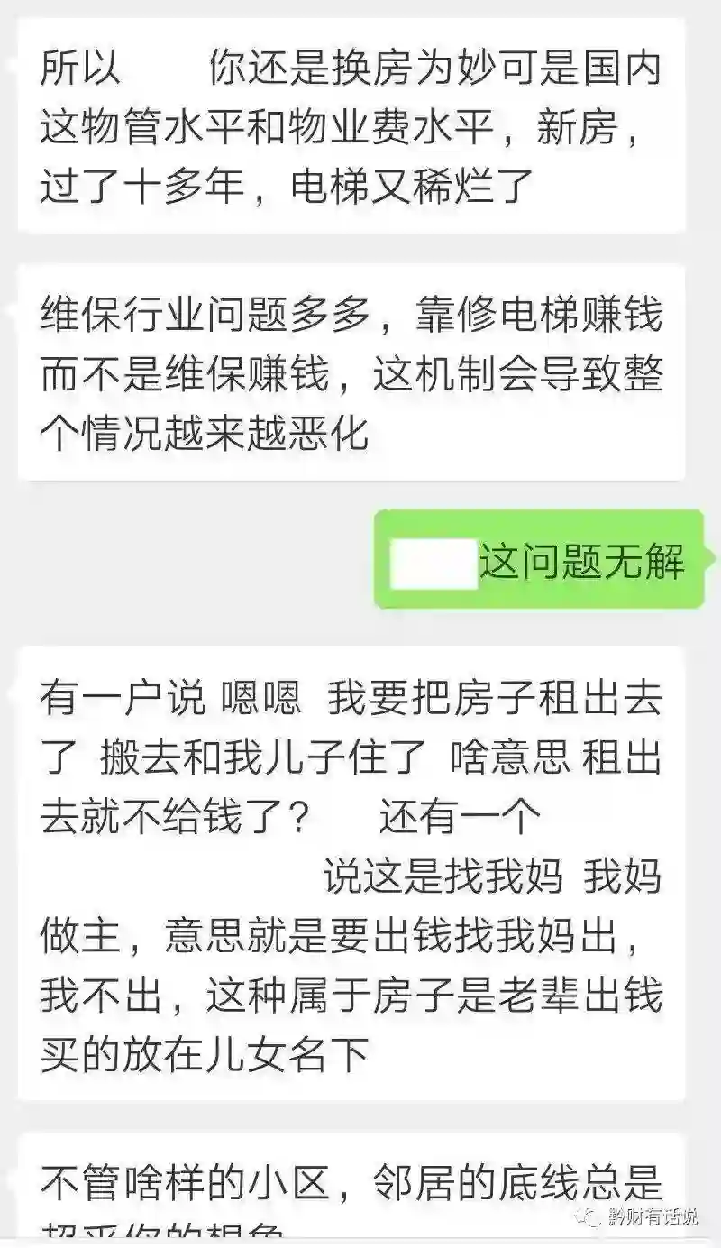 有一次业主群里聊了很久,大部分业主都明白10年不变的物业费不是长久之计,时间长了肯定影响小区品质,并最终影响房价。相比于房价波动而言,物业费纯属毛毛雨,但大家不愿提升物业费的理由也很简单: