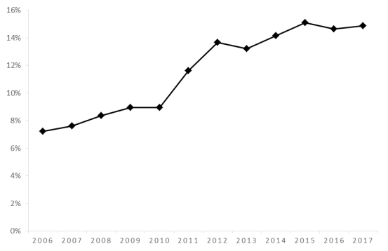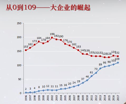 所以说这个给大家简单的看一个图示,我们看到中国人比较喜欢讲的《财富》全球500强企业,这是财富杂志每一年的7月份根据这个企业销售收入,做的一个全球排名,中国企业在1996年有2家企业进去,到2017年去年是109家,到今年的话是111家,如果把台湾企业加进去我们是121家,美国126家,按照这样的数据的话中国有可能在未来两年左右超过美国,下面这条线会超过上面的这条线。