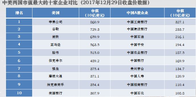 在这种情况下原材料、能源、资金这样的行业就特别容易出现大企业, 这应该是在A股市场去年底,我们算了一下,前10大市值最大的企业,有7家金融机构2家是中石油、中石化,还有这个茅台怎么归都行,生产要素也行,这样的布局本身反映出中国经济在过去40年的特点,我们上市公司的这个企业构成本身,跟这个特点是高度吻合的。