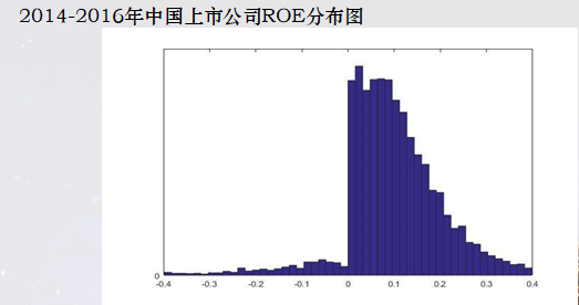我再举一个例子我们上市公司的质量,从各个角度来分析,这个图我画了15年,每年都画,每年都没有变化,这是我们上市公司ROE大家比较熟悉,直方图,显然不是正态分布,明显在0这个点上有很大的跳跃,就说明中国上市公司在经济层面都非常的巧妙,总能把地位做到高0点,这是美国正态分布,中国这个是不是一个正态分布,大家可以做这样的结论。
