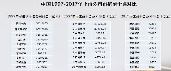 再看中国1997年到2017年每十年我们做这样的一个分析,最大的市值企业,1997年是四川长虹,到2007年发生变化,中国石油,在2007年的11月份,它的市值到过1万亿美金,但是没太久,到2017年大家看到的就是这个数字企业排名发生很大的变化,排名第一第二的企业在这个比排行榜的起始年份还没有诞生,20年后它是中国最大的市值企业,虽然在海外上市,我们到2028年的时候我们再看这个图的时候,我相信我们会看到很多完全不一样的企业,可能来自不同的行业,大家也可以想像得出来。