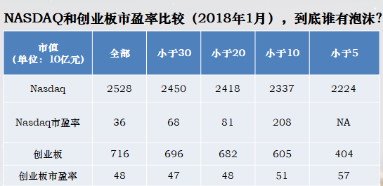 自己做了另外一个分析,对我们的启发,特别是做机构投资,对股票的价格发现,会比较敏感。给大家看一下,创业板市场跟纳斯达克做的比较,今年2018年底的数字我们做的分析,总体来讲的话,大家看第一列全部企业都包含进来,纳斯达克的市盈率是36倍,我们是48倍,美股的泡沫很高,中国创业板会不会有泡沫,这是另外的角度。
