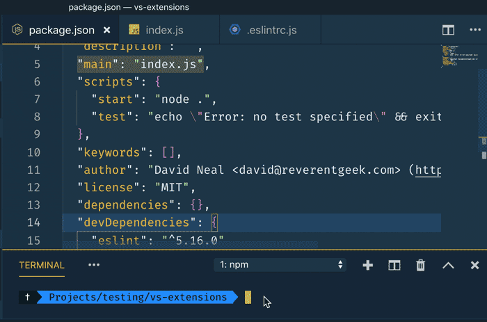 npm扩展组件有两个功能:运行编辑器中webpack.json定义的npm脚本,并验证package.json中列出的文件包。