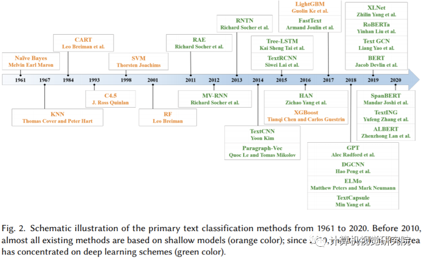 主要文本分类方法的示意图如图2所示。从1960年代到2010年代,基于浅层学习的文本分类模型占主导地位。浅层学习意味着基于统计的模型,例如朴素贝叶斯(NB),K近邻(KNN)和支持向量机(SVM)。与早期的基于规则的方法相比,该方法在准确性和稳定性方面具有明显的优势。但是,这些方法仍然需要进行功能设计,这既耗时又昂贵。此外,它们通常会忽略文本数据中的自然顺序结构或上下文信息,这使学习单词的语义信息变得困难。自2010年代以来,文本分类已逐渐从浅层学习模型变为深层学习模型。与基于浅层学习的方法相比,深度学习方法避免了人工设计规则和功能,并自动为文本挖掘提供了语义上有意义的表示形式。因此,大多数文本分类研究工作都基于DNN,DNN是数据驱动的方法,具有很高的计算复杂性。很少有研究专注于浅层学习模型来解决计算和数据的局限性。