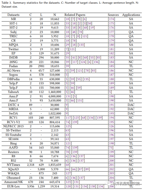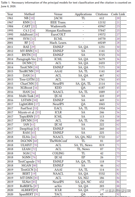 •在表1中介绍了文本分类的过程和发展,并根据出版年份总结了经典模型的必要信息,包括场所,应用程序,引文和代码链接。