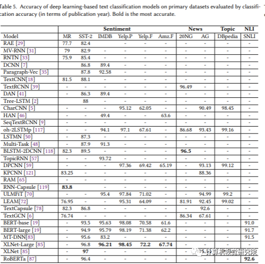 •在表5中总结了经典模型在基准数据集上的分类准确度得分,并通过讨论文本分类面临的主要挑战。