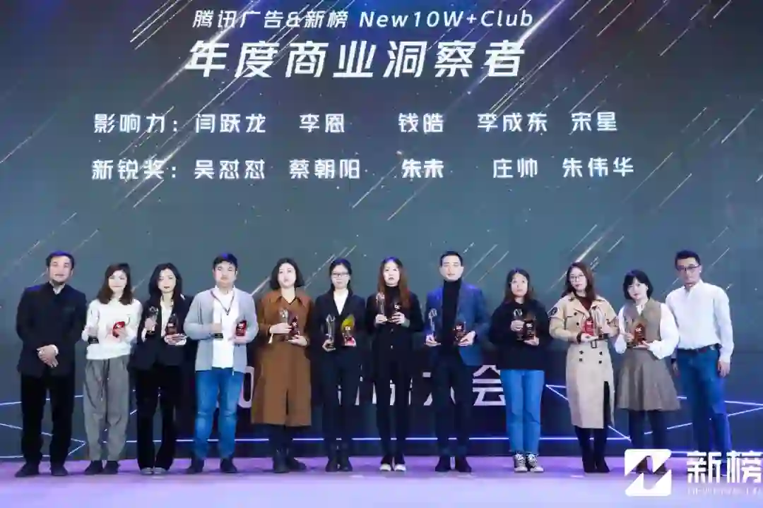 为了鼓励媒体人挖掘更多优质服务内容,腾讯广告与新榜在New 10W+Club年度商业洞察者颁奖典礼上,对五位自媒体人进行【影响力】嘉奖,他们分别是闫跃龙、李恩(LADYMAX)、钱皓(钱皓频道)、李成东(东哥解读电商)、宋星(纷析数据)。同时,吴耀谦(吴怼怼)、蔡朝阳(青眼)、朱未(FBIF食品饮料创新)、庄帅(庄帅零售电商频道)、朱伟华(朱伟华后市场),五位优秀的自媒体人也获得【新锐奖】表彰。