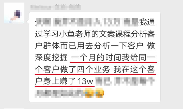 有一个小伙伴,反复听了第二阶段文案底层逻辑的那节课,运用相关思路,成功在同一个客户身上赚了13万元,现在已经出来创业了!