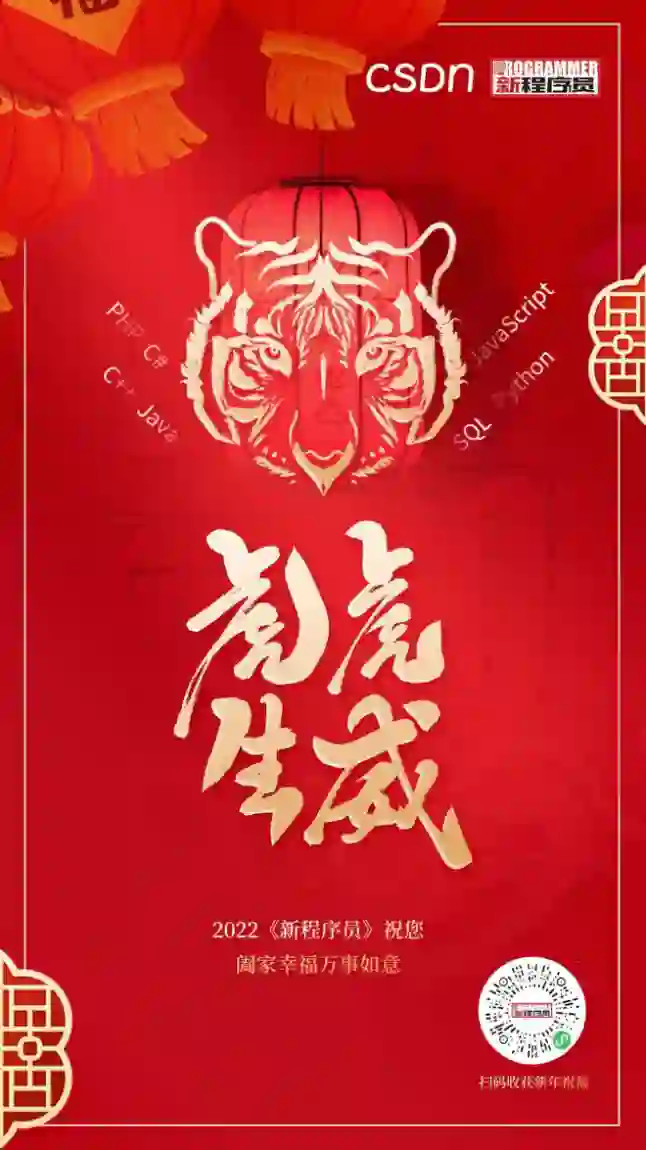 金牛辞冬去,瑞虎迎春来。值此辞旧迎新、万象始更新之际,CSDN全体员工向一直以来关心和支持我们的读者、用户、技术专家、程序员朋友们致以最美好的新年祝福,祝大家虎年大吉,虎虎生威,阖家欢乐,身体健康,工作顺利,万事如意!在新的一年虎跃龙腾、写代码虎头虎尾、一虎之力“BUG”扫光光!