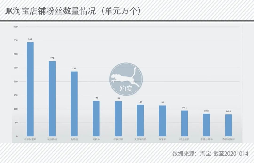 总体上,目前第一梯队的有中牌制服馆、兔缝缝、梗豆物语等,豹变以主要交易平台淘宝店铺粉丝数量作为观察指标,最多的中牌制服馆,淘宝粉丝数量超过340万。