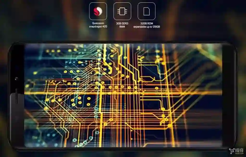 不过,仔细看就不难发现,其实这款机子最大的特色也就是 18:9 比例的屏幕而已,上下挡板是做得比一般手机更窄了些,但左右依然是大黑边。关键是,这款机子的配置远落后于今天的旗舰级,例如仅 1440×720 像素的分辨率,还有骁龙 425 四核处理器,内存也只有 3GB,标配储存 32GB 并提供扩展还不错。