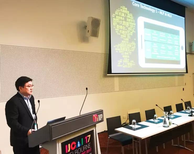 AI科技评论注:图为朱频频在IJCAI Industry Day上受邀做《聊天机器人的产业应用实践》的报告瞬间。