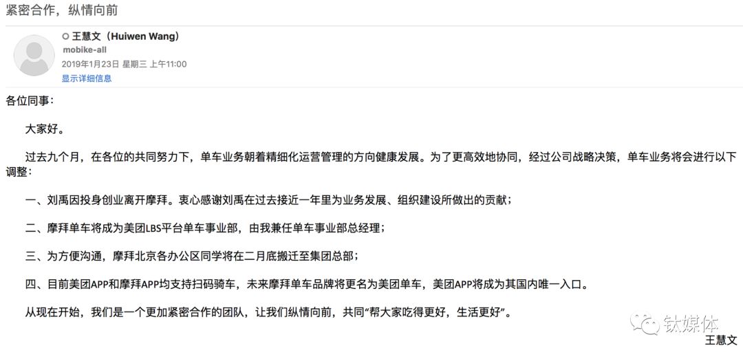 2019年1月23日,摩拜全面接入美团App,并改名美团单车。同时现任CEO刘禹将离开摩拜去创业。