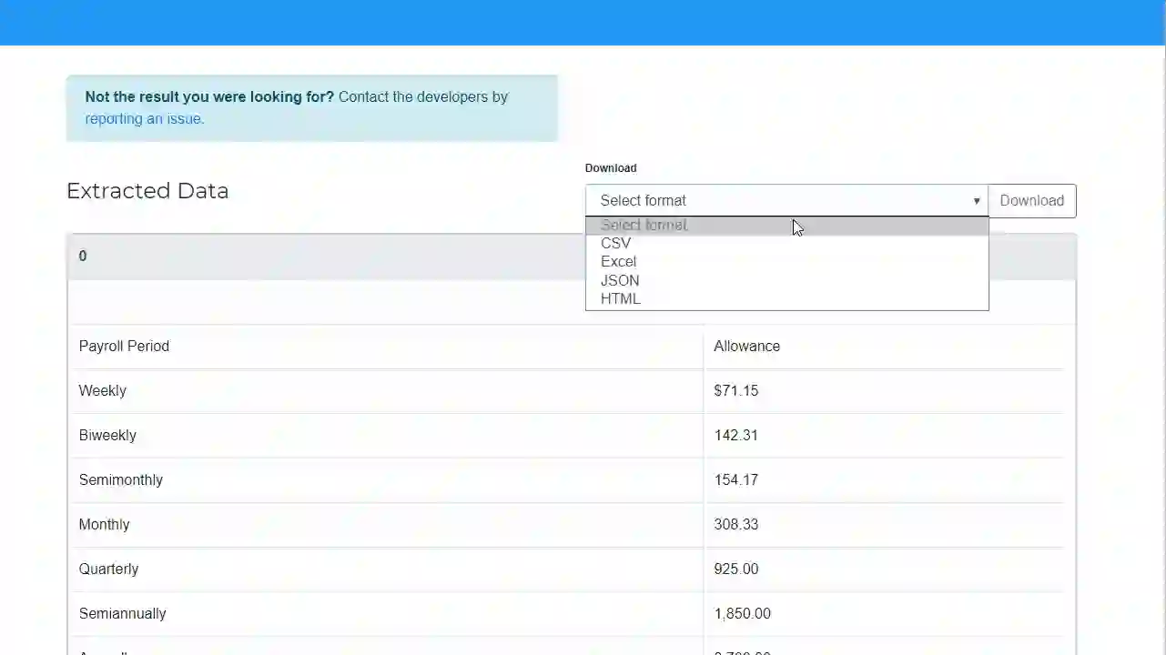 最后,你可以查看提取的表格并将其下载为 CSV 或 Excel 文件。Excalibur 还支持 JSON 和 HTML 格式。