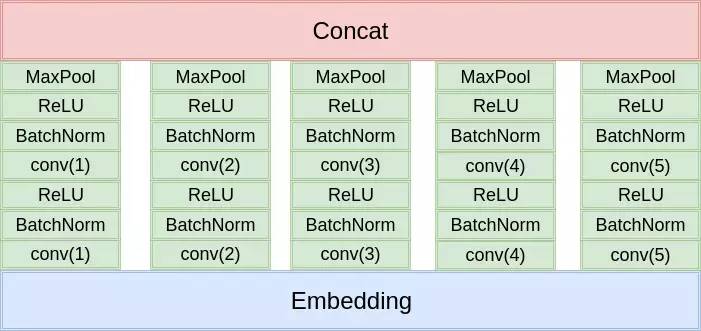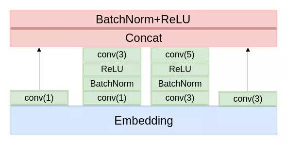 这个是我自己提出来的,参照 TextCNN 的思想(多尺度卷积核),模仿 Inception 的结构设计出来的,一层的 Inception 结构如下图所示,比赛中用了两层的 Inception 结构,最深有 4 层卷积,比 TextCNN 更深。