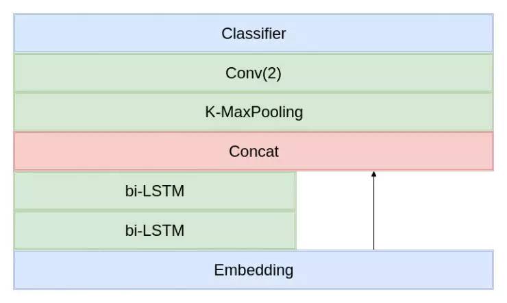 参考原论文的实现,和 RNN 类似,也是两层双向 LSTM,但是需要和 Embedding 层的输出 Concat(类似于 resnet 的 shortcut 直连)。