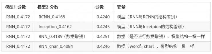 从第一行和第二行的对比之中我们可以看出,模型差异越大提升越多(RNN 和 RCNN 比较相似,因为他们底层都采用了双向 LSTM 提取特征),虽然 RCNN 的分数比 Inception 要高,Inception 对模型融合的提升更大。