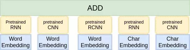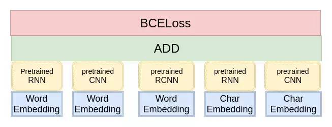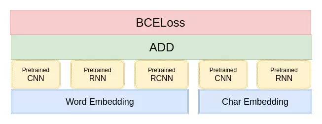 其实模型融合的方式,我们换一种角度考虑,其实就是一个很大的模型,每一个分支就像多通道的 TextCNN 一样。那么我们能不能训练一个超级大的模型?答案是可以的,但是效果往往很差。因为模型过于复杂,太难以训练。这里我尝试了两种改进的方法。
