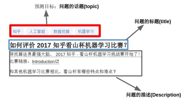 测试集包含 21 万条问题的标题(title), 问题的描述 (description),需要给出最有可能的 5 个话题(topic)