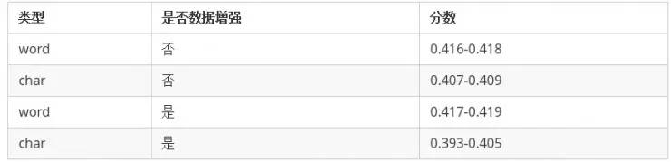 训练的时候,每个模型要么只训练基于词(word)的模型,要么只训练基于字(char)的模型。各个模型的分数都差不多,这里不再单独列出来了,只区分训练的模型的类型和数据增强与否。