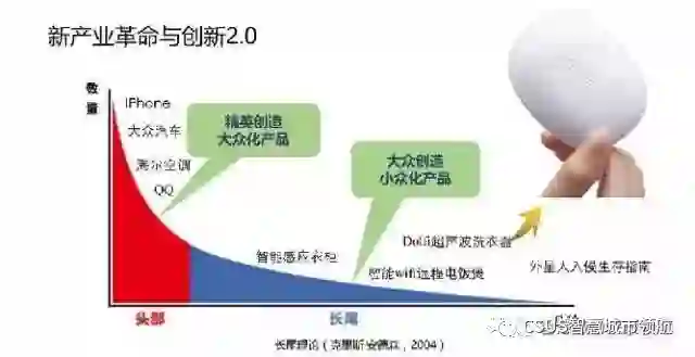 创新2.0推动了经济社会的深刻变革,引发了新产业革命,激发了大众创造。克里斯·安德森在《长尾理论》一书中对精英创造到大众创造时代的演变进行了生动的描述(见图一)。埃里克·冯·希普尔在《民主化创新》一书中则进一步提出面向知识社会的创新2.0正在推动创新的民主化进程。大众创造、大众创新的发展推动了全球创客、众创的蓬勃兴起。