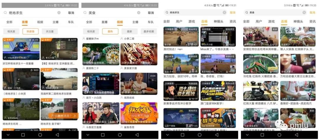 搜索内容上虽然没有区别但在功能上来讲,斗鱼稍胜一筹,可以看到,斗鱼搜索结果中可以进行排序方式选择,即热度,相关度等不同方式的选择。这点虎牙没有,虎牙只有一个默认的排序,依然坚持了其只做核心功能的风格。