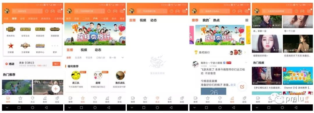 上图中为两者的发现页面对比,左一是虎牙,其它为斗鱼。可以发现虎牙依然是较为精简的,虎牙有的内容斗鱼基本都有,而斗鱼则多出了不少功能。例如车队,星球,签到。
