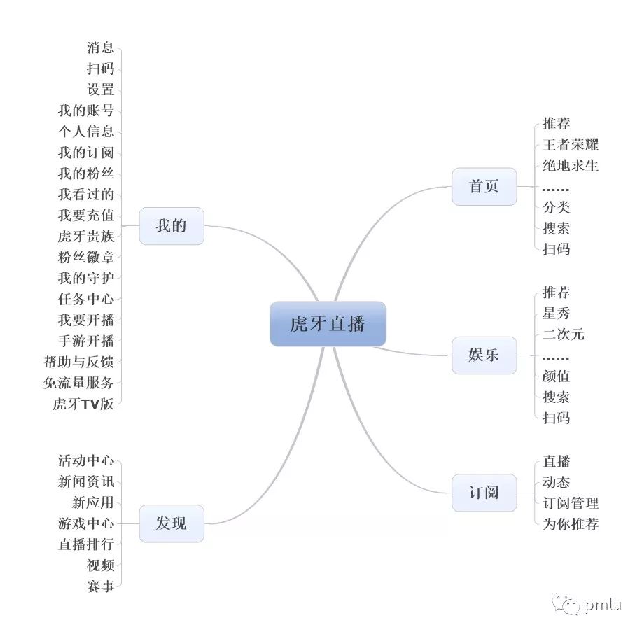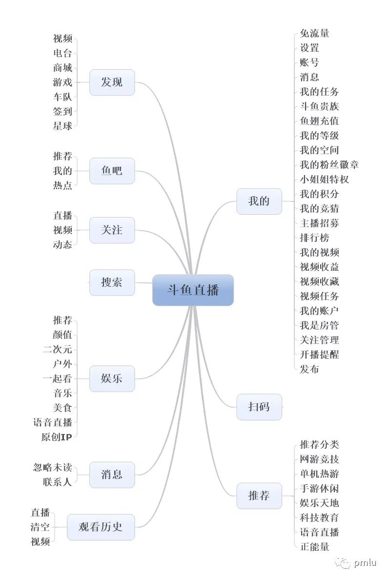 斗鱼直播的产品结构图如上所示,总的来说有一个特点是一级标签非常多。我的,扫码,搜索,历史,消息都作为一级标签而存在。这种设计是很少见的,作者个人并不是很喜欢这种设置方式。过多的一级标签会让层次混乱,界面重复度高,且使用也没有方便多少。