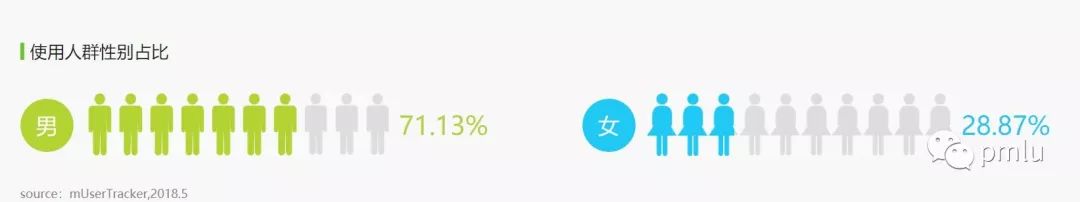 性别比例是产品的重要特征之一,男女用户的习惯差异是非常大的。从上图可以发现两者的性别比例很相似,均为女性比例占了三分之一都不到。出现这种情况其实也很好理解,游戏直播主要是以游戏为主的,而游戏用户中女性本来就很少。