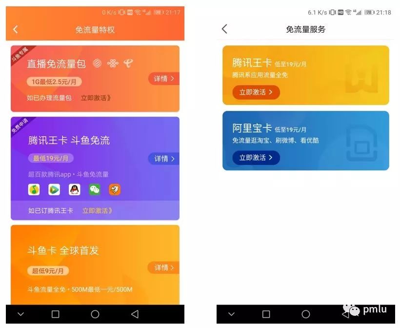 上图是两个软件的流量解决方案,都是通过购买免流量服务来实现的,其中斗鱼提供的服务种类要稍微多一些,而虎牙则相对少一点。腾讯王卡虽然可以对腾讯系的所有产品免流量,但价格稍贵。