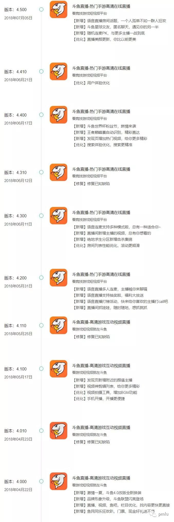 斗鱼的近十次更新如上图所示,时间跨度从4月22日到7月5日。在不到两个半月的时间里更新了10次,平均每周就要更新一次了,这个速度还是很快的。