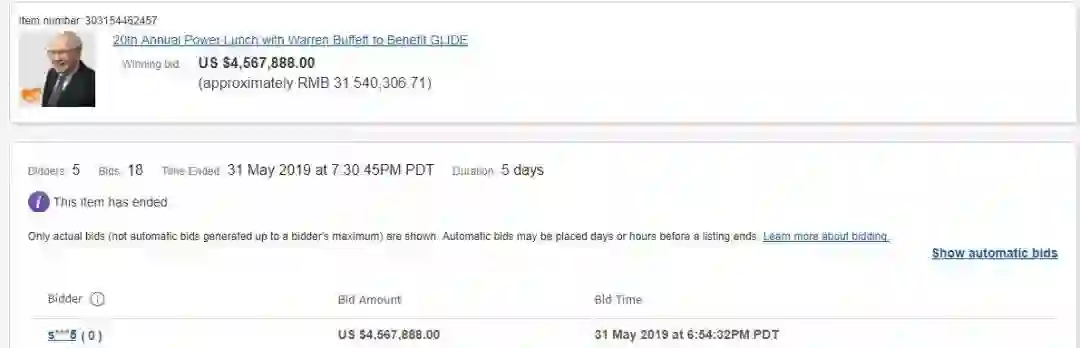 2019年巴菲特慈善午餐拍卖结果,在ebay揭晓,成交价创出历史新高,达到4567888美元(约合人民币3154.03万元)。今年的获胜者身份信息还没公布,此前有报道称,拍下此次巴菲特午餐的人很可能是波场TRON创始人孙宇晨,但未得到证实。