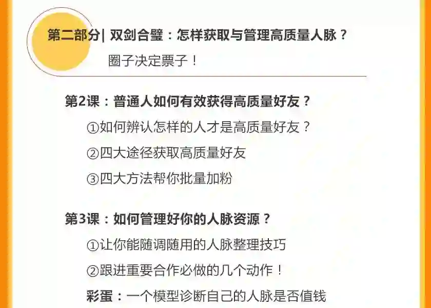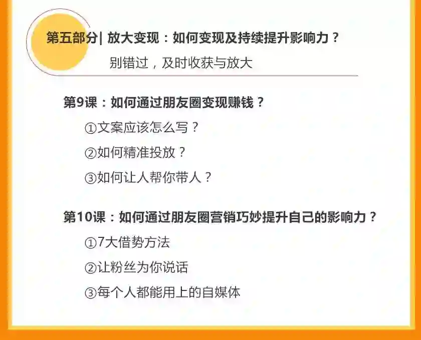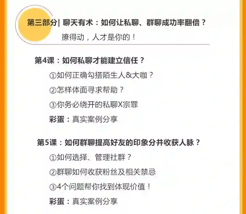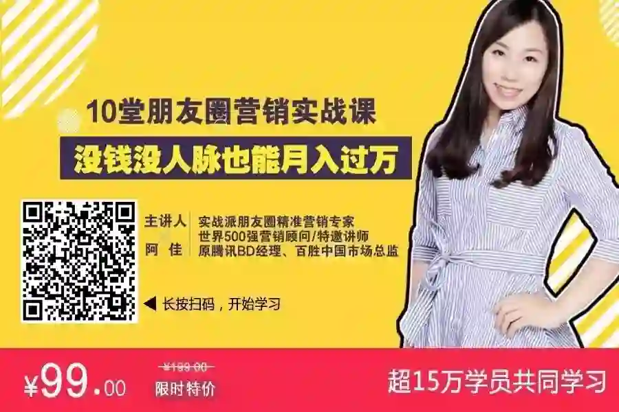 课程中,她将通过真实案例的拆解分析,从如何获取高质量好友、如何让聊天成功率翻倍、如何变现赚钱等五大模块精细讲解朋友圈营销大获成功的干货。