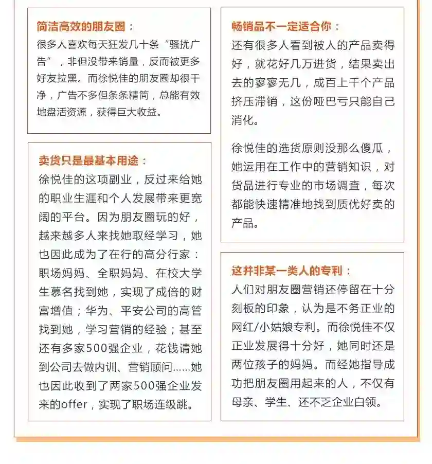 简洁高效的朋友圈:很多人喜欢每天狂发几十条“骚扰广告”,非但没带来销量,反而被更多好友拉黑。而徐悦佳的朋友圈很干净,广告不多但条条精简,总能有效地盘活资源,获得巨大收益。