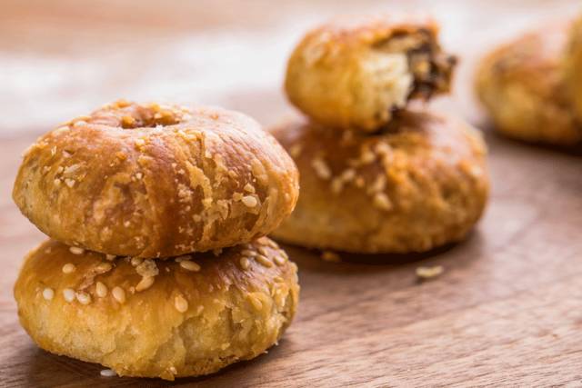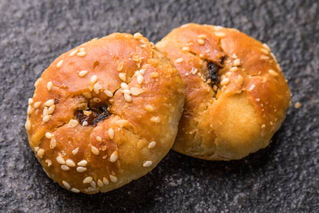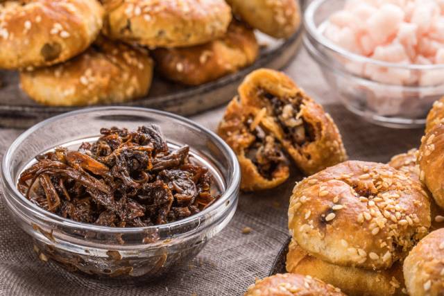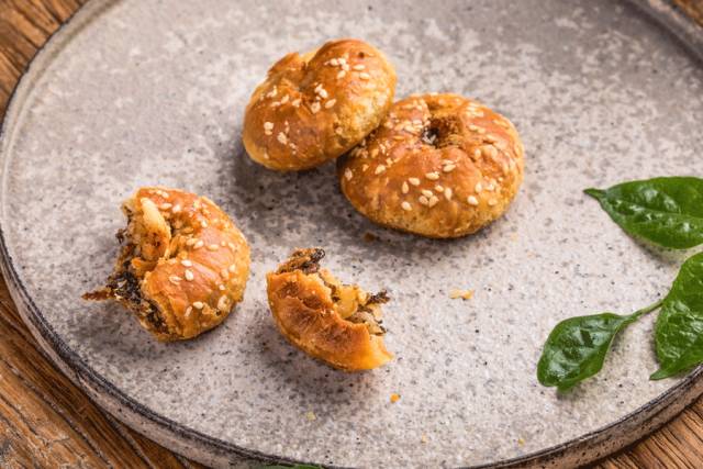 梅干菜+肉丁的内馅,酥皮上撒白芝麻,一口咬下去,酥脆爽口,碎肉丁加上梅干菜特有的香气,咸甜中带着辣味,绝了!