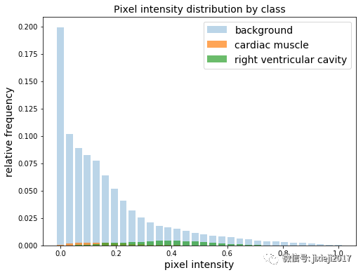 同样常见的是,由于大部分像素都属于背景,所以存在类别的不平衡。将像素强度归一化到0和1之间,我们看到在整个数据集中,只有5.1%的像素是右心室腔的一部分。