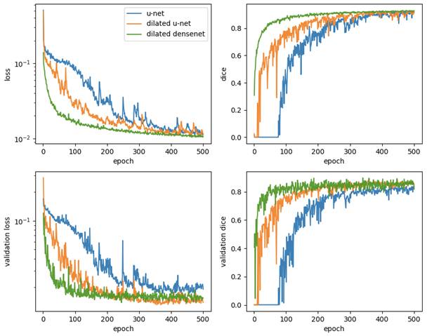 典型的学习曲线如下所示。在所有情况下,验证损失高原并没有表现出过度拟合的上升特性。在每个周期,都可以看到扩展densenets的学习速度相对于u-net和扩展u-net的惊人表现。