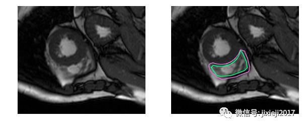 不使用医学术语,识别右心室困难的原因是:左心室是一个厚壁的圆柱型区域,而右心室是一个不规则形状的物体,较薄的心室壁有时会与周围的组织混在一起。下图是MRI快照中手工绘制的右心室内壁和外壁(心内膜和心外膜)轮廓:
