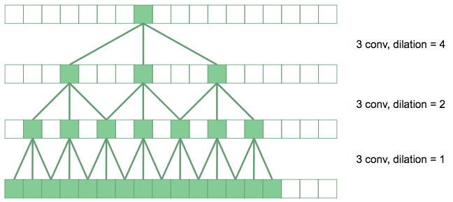 扩展卷积通过扩展因子空出卷积中累加的像素。在上图中,底层的卷积是常规的3×3卷积。上一层,扩展因子为2,我们将卷积扩大了2倍,所以在原始图像中的有效感受野是7×7。顶层卷积扩大4,产生15×15个感受野。相较于堆叠传统卷积的线性膨胀,扩展卷积产生具有深度的指数级膨胀的感受野。