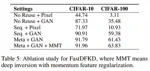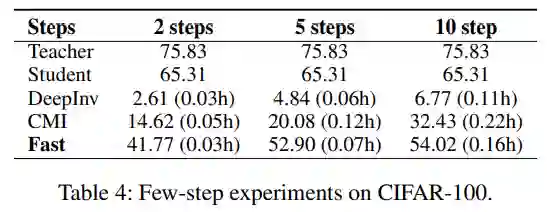 与非生成方法一样,FastDFKD 还可以优化用于数据合成的小批量。如表 1 所示,5-step FastDFKD,即 Fast_5,与现有的生成方法相比,可以实现 10 倍的加速,与非生成方法相比,甚至可以达到 100 倍以上的加速。