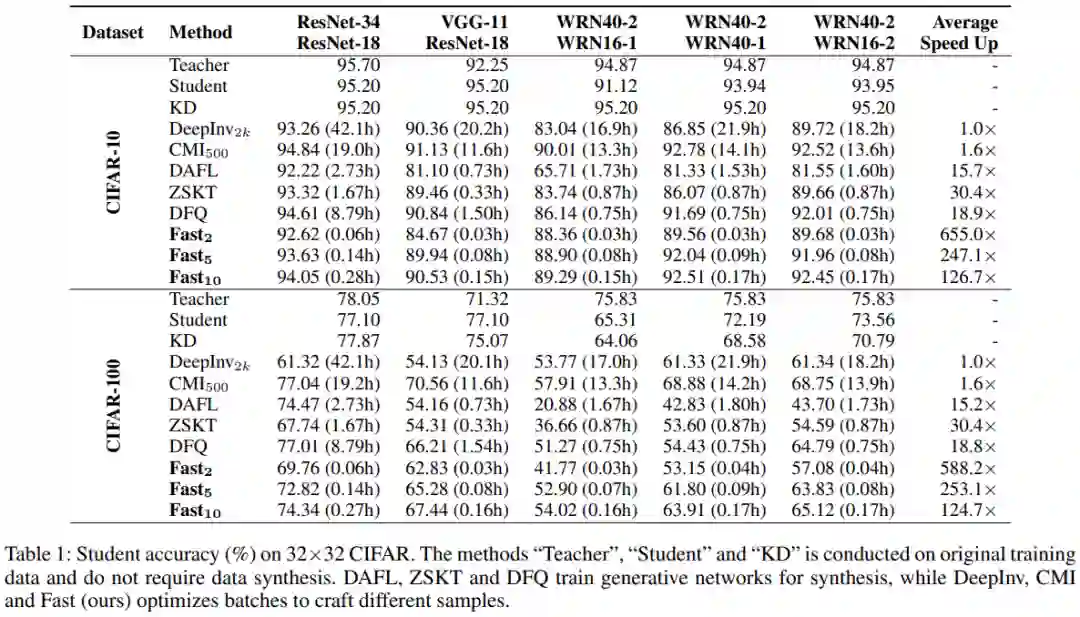 CIFAR-10 和 CIFAR-100 分类结果。在 CIFAR-10 和 CIFAR-100 数据集上获得的学生模型准确率如表 1 所示。在表中,基线「Teacher」、「Student」和「KD」使用原始训练数据训练网络,不需要数据合成。