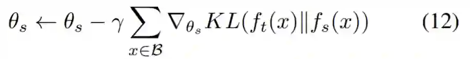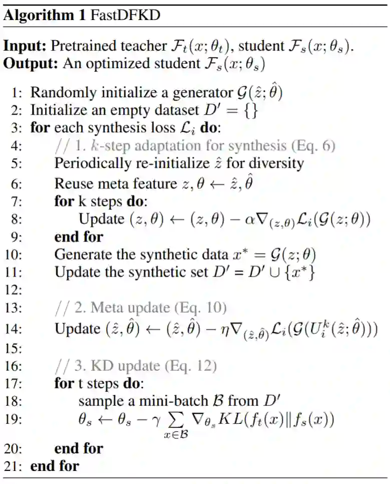 算法 1 分为三个阶段:用于数据合成的 k-step 适应;用于通用特征学习的元学习 step;通过优化 KL 散度来更新学生模型的的步骤如下: