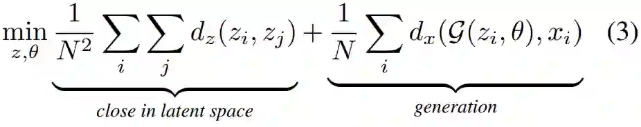 上式 (3) 中 d_z 和 d_x 分别代表潜在空间和输入空间中的距离指标。上述优化旨在为数据集 D’找到一种生成过程