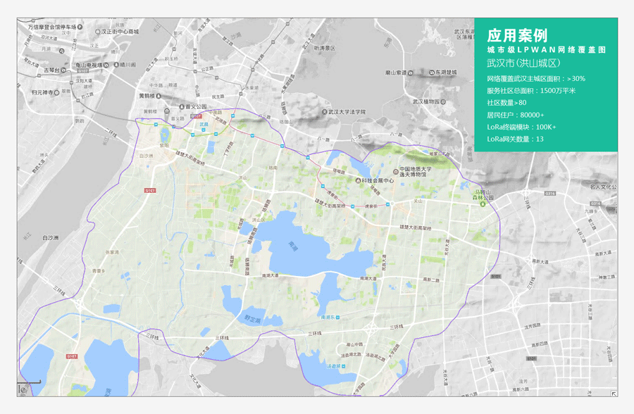 慧联无限在武汉市洪山区建成了省会级城市中心城区低功耗广域物联网平台,共建设了城市级基站13座,覆盖面积210平方公里,目前已实现了智慧消防、安防、停车、环境监测、物业管理等落地应用。