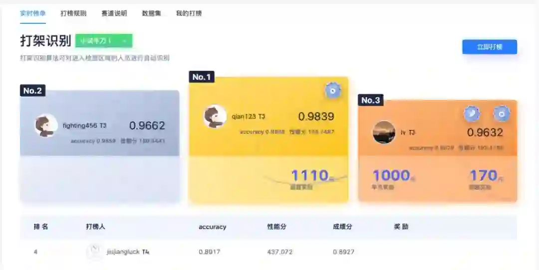 后来,极市平台推出了一种新的项目合作模式,即极市打榜。我第一次参与时选择了打架识别这一榜单,按照平台学习、算法调研、模型训练、测试优化等步骤完成了打榜过程,达到了0.96的分数,虽然后来被人超越了哈哈。