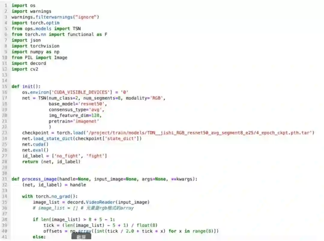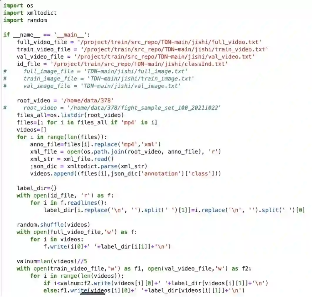 对于我个人而言,在调研一种新的算法时,一般有以下几个途径:百度/谷歌相关文章(大力出奇迹)、在主要顶会(CVPR/ICCV/ECCV等)的工作中寻找、在github等代码网站搜索,最后,极市公众号也会推送最新的CV工作。在上述渠道初步查找后进行筛选,选择1-2个可行方案。经过初步调研,我选择了CVPR2021的工作https://github.com/MCG-NJU/TDN,用于高效动作识别的时域差分网络,与打架识别任务比较契合。由示例数据集可以看出,训练数据长度大多在几秒中,与TDN论文中任务数据也较为接近,且打架动作识别在通用数据集中也是常见的类别,微调训练可以更好的泛化应用。