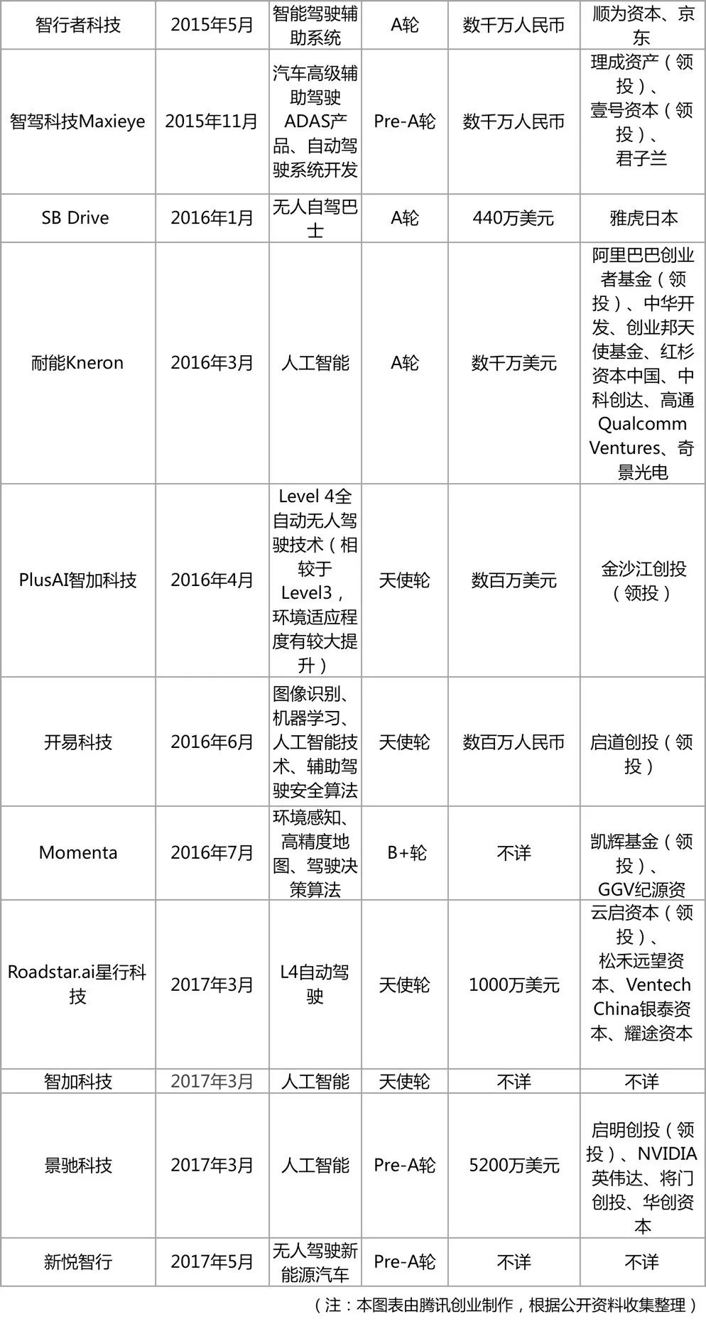 下图是根据公开资料不完全整理,从公司的成立时间、企业类型、融资情况及金额、轮次等方面对无人车创业公司的融资现状进行了总结。