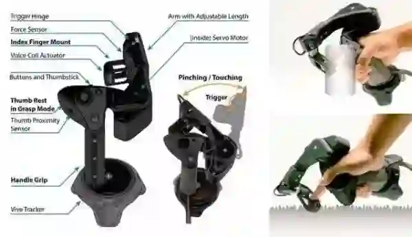 CLAW是微软研究团队开发的第一款新型多功能触觉控制器,通过使用单个电机,CLAW将VR控制器的概念扩展至一款多功能触觉反馈工具。Haptic Wheel 使用的驱动转轮通过上下移动来模拟手指与虚拟物体表面的触碰,并且通过旋转来模拟用户沿着虚拟表面滑动时产生的剪应力(shear forces)和滑动感。